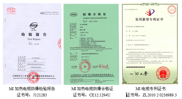 安徽環(huán)瑞MI發(fā)熱電纜獲得了國(guó)家專利證書及石油化工協(xié)會(huì)頒發(fā)的防爆合格證.