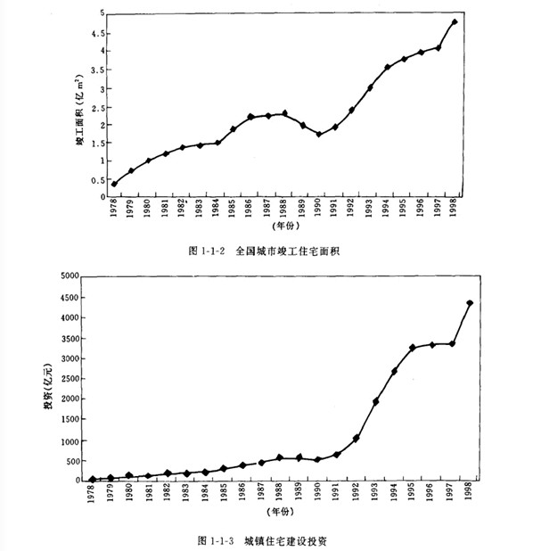 我國地域廣闊.人口眾多.房屋建筑規(guī)模巨大。其中住宅建設約占居住建筑的92%.而住宅,是世界各國都面臨的社會問題。“人人享有適當?shù)淖》?rdquo;已成為聯(lián)合國第二次人居大會所提出的戰(zhàn)略目標。改革開放以來.從1979年到1998年底.我國城鄉(xiāng)新建住宅建筑面積158億 ㎡其中城鎮(zhèn)住宅宅 約35億 ㎡.農(nóng)村作宅約123億MI.全國城市人均居住面積從3. 6 ㎡增加到9.3  ㎡(圖一1一1).竣 工面積從3 752萬 ㎡增加到47 600萬 ㎡(圖1-1-2).城鎮(zhèn)住宅建設投資從39.21億元增加到4  310.81億元(圖1-1 3). 1.7億戶遷入新居."八五"期間共完成城市住宅建設投資8 543億元.竣工 住宅10.5億 ㎡,僅1995年住宅竣工面積3.3億 ㎡.比“七五”期間增長76%.九五.期間計劃建設 住宅12億 ㎡,比“八五”期間增長14.3%.到1999年底。我國設城市加為668個.當年全國城市新 建房屋竣工面積4.362 5億㎡.其中住宅2.971 6億㎡.當年底.全國住宅總使用面積為30.505 2億 ㎡.總居住面積為21.011 2億㎡.人均使用面積達到14.2 ㎡.人均居住面積達到9. 8 ㎡分別比上 年增長0.6和0. 5 ㎡.居民生活條件大有改善。住宅建設量大面廣.至今仍呈上升趨勢.而且這個 上升趨勢還將持續(xù)20-30年。由此看出,我國住宅建設正處于快速發(fā)展階段.不僅是中國歷史上的 最高峰.也是世界上任何一個國家所不可比擬的。