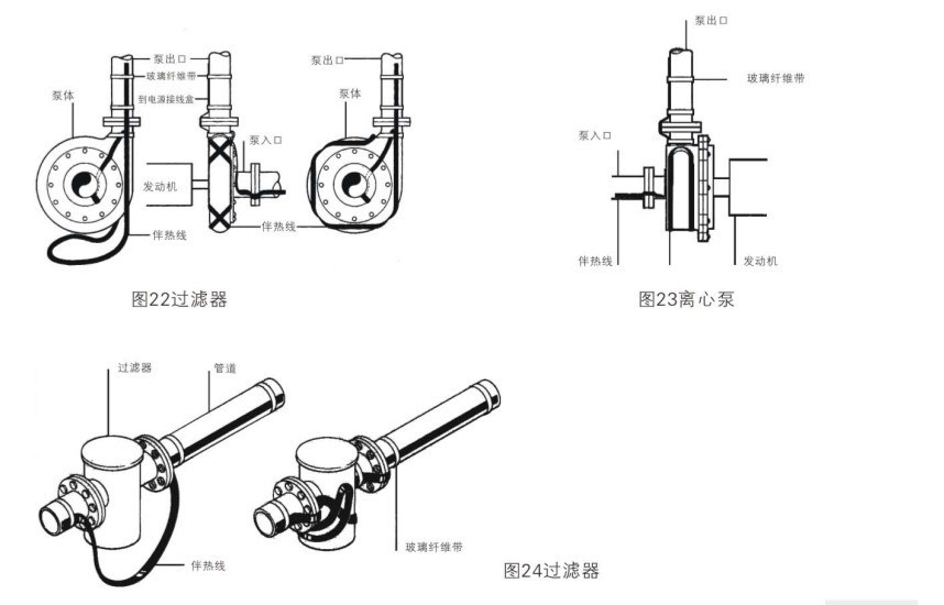 以上復(fù)雜管線電伴熱安裝前夕,需根據(jù)現(xiàn)場(chǎng)不同管徑,長(zhǎng)度,計(jì)算熱損耗。確定電伴熱安裝比例與電伴熱帶米數(shù)(其中泵,過(guò)濾器,儀表等其他管道附件,需預(yù)留數(shù)量)。根據(jù)管道的配備相應(yīng)的電源接線盒,鋁箔膠帶,熱敏膠帶與不銹鋼帶等。其閥門,泵,過(guò)濾器,儀表電伴熱帶安裝圖列參照下圖。