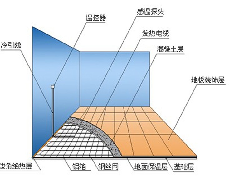 發(fā)熱電纜采暖系統(tǒng)由發(fā)熱電纜和溫控器兩部分組成,發(fā)熱電纜鋪設(shè)于地面中,溫控器安裝于墻面上。當(dāng)室內(nèi)環(huán)境溫度或地面溫度低于溫控器設(shè)定的溫度時(shí),溫控器接通電源,發(fā)熱電纜通電后開始發(fā)熱升溫,發(fā)出的熱量被覆蓋著的水泥層吸收,然后均勻地加熱室內(nèi)空氣,還有一部分熱量以遠(yuǎn)紅外輻射的方式直接釋放到室內(nèi)。該種方式的采暖系統(tǒng)把整個(gè)地面作為散熱器,室內(nèi)溫度上層低而下層高,有溫足而頂涼的感受,使您感到舒適而自然。