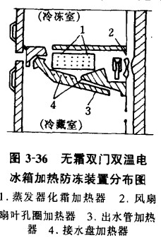 加熱防凍裝置中的出水管加熱器處于經(jīng)常加熱狀態(tài),接水盤(pán)加熱器和風(fēng)扇扇葉孔圈加熱器則僅在蒸發(fā)器加熱化霜時(shí)才工作。接水盤(pán)加熱器裝置在接水盤(pán)的外表面,其作用是防止霜水滴人接水盤(pán)內(nèi)凍結(jié)積累而損壞周?chē)Y(jié)構(gòu)。裝置出水管加熱器的目的是防止霜水導(dǎo)出箱外時(shí)發(fā)生“冰堵”,造成霜水滋出盤(pán)外,淋濕并污染食品。風(fēng)扇扇葉孔圈加熱器裝置在風(fēng)扇扇葉孔圈部位,在對(duì)蒸發(fā)器加熱化霜時(shí)它對(duì)扇葉孔圈部位加熱,防止該部位因凝霜過(guò)厚而將扇葉卡住,造成箱內(nèi)冷風(fēng)的正常循環(huán)中斷,甚至燒毀風(fēng)扇電機(jī)。