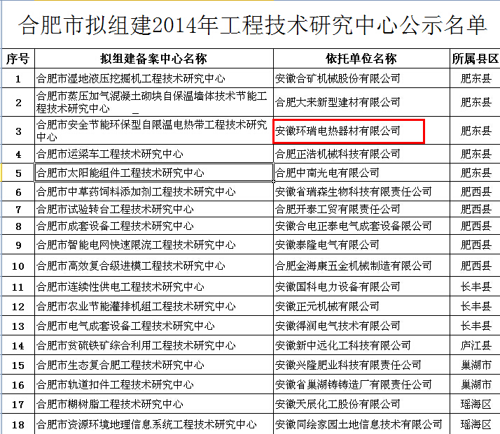 根據(jù)《合肥市工程技術(shù)研究中心管理辦法》要求,擬組建2014年合肥市工程技術(shù)研究中心,安徽環(huán)瑞電熱器材有限公司成功進(jìn)入合肥市工程研究中心名單: