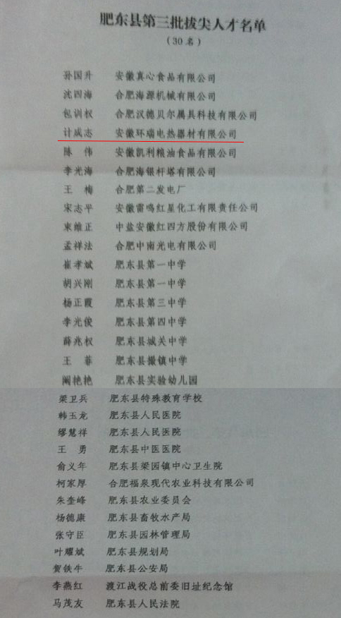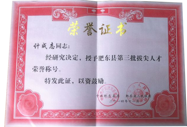 肥東縣委、縣政府為表彰環(huán)瑞公司對(duì)肥東縣當(dāng)?shù)亟?jīng)濟(jì)發(fā)展所作的貢獻(xiàn),特授予環(huán)瑞董事長(zhǎng)計(jì)成志“肥東縣第三批拔尖人才”榮譽(yù)稱號(hào)。