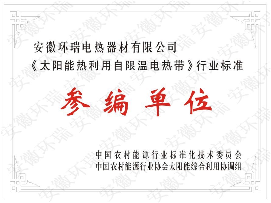 安徽環(huán)瑞電熱器材有限公司長(zhǎng)期致力于自限溫電伴熱帶在各行業(yè)的應(yīng)用,尤其是太陽(yáng)能專用自限溫電伴熱帶,并研發(fā)出一種安全節(jié)能的太陽(yáng)能電伴熱帶-納米阻燃本質(zhì)安全型電熱帶,獲得了國(guó)家專利證書和省高新技術(shù)產(chǎn)品,針對(duì)目前國(guó)內(nèi)層次不齊的電熱帶質(zhì)量,為了規(guī)范太陽(yáng)能電熱帶的市場(chǎng),提高產(chǎn)品的質(zhì)量。安徽環(huán)瑞與多家伴熱同行企業(yè)共同起草《太陽(yáng)能熱利用自限溫電熱帶》,此標(biāo)準(zhǔn)由中國(guó)農(nóng)村能源行業(yè)協(xié)會(huì)提出。能源行業(yè)農(nóng)村能源標(biāo)準(zhǔn)化技術(shù)委員會(huì)歸口,是專門針對(duì)太陽(yáng)能行業(yè)的自限溫電熱帶標(biāo)準(zhǔn),具有重要意義。